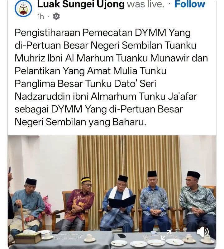 “Selanjutnya, Sidang Khas DKU pada 17 April 2026 telah bersetuju menasihat dan menerima kesepakatan Telaga Undang, Waris Klana Hulu, Luak Sungei Ujong yang memberhentikan Datuk Mubarak Dohak sebagai
